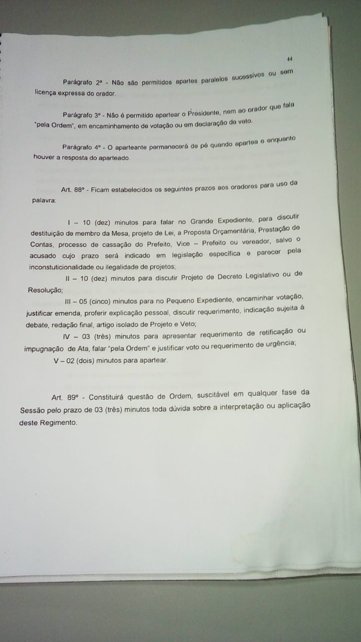 Com isso, passamos a investigar e constatamos que os vereadores da bancada situacionista criaram um inciso “fantasma” no art. 88, não se sabe de onde veio essa ideia que o regimento da “Casa” concede 10 minutos para seus respectivos líderes.