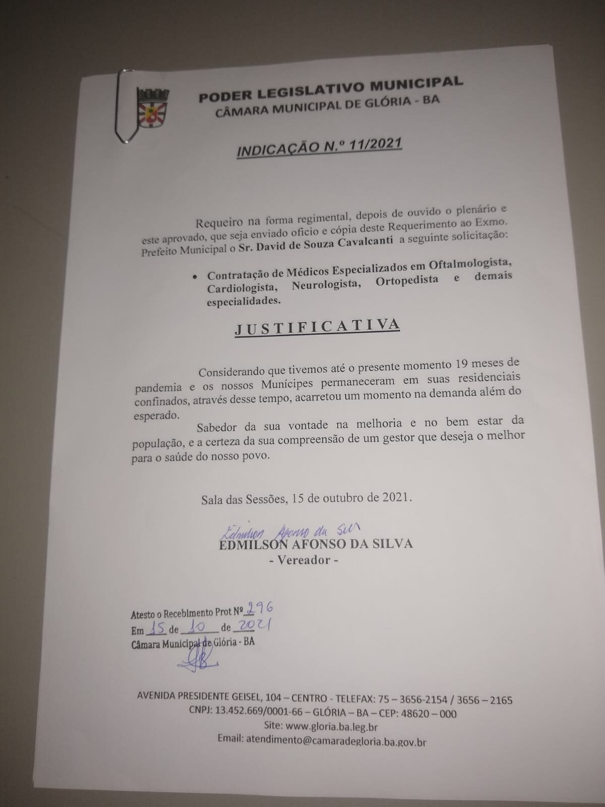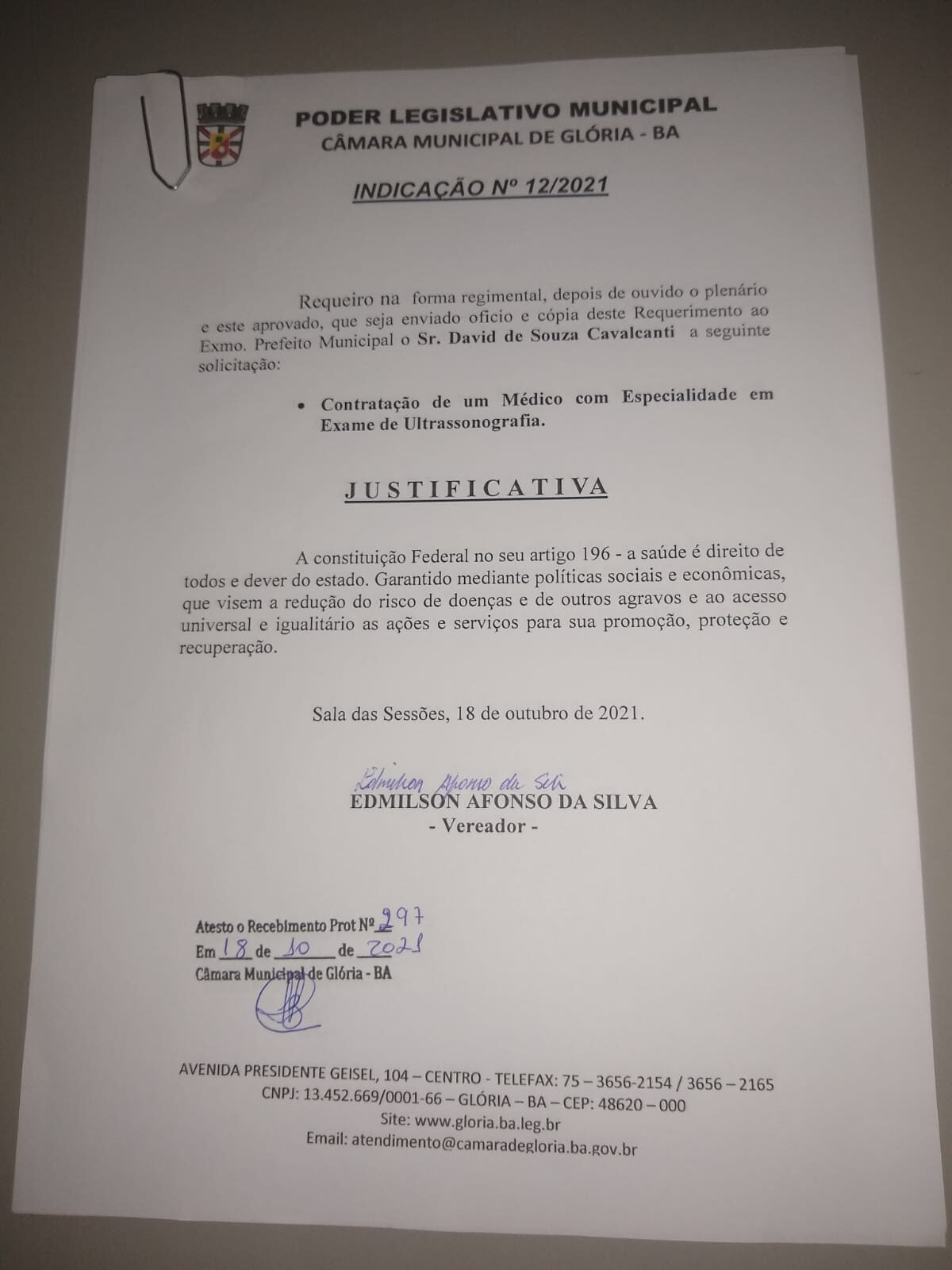 O Vereador e Presidente da Câmara Municipal de Vereadores da cidade de Glória Bahia Edmilson Afonso da Silva-Progressistas “Missão de Dotor” teve dois grandes Requerimentos aprovados por unanimidades dos colegas vereadores na Sessão Ordinária de 26 de outubro de 2021.