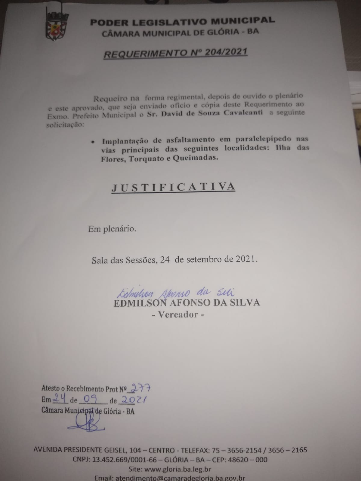 O Vereador e Presidente da Câmara Municipal da cidade de Glória Bahia Edmilson Afonso da Silva “Missão de Dotor”-Progressistas entrou com um Requerimento de Número 204/2021, solicitando do Prefeito David Cavalcanti a Construção de Pavimentação em Paralelepípedo nas ruas das Comunidades Rurais do município.