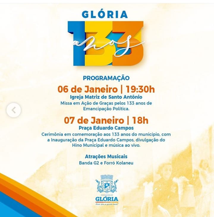 A Prefeitura Municipal de Glória Bahia, através da Secretaria de Governo em comemoração aos 133 anos de Emancipação Política da cidade, montou uma Programação Especial para os glorienses.