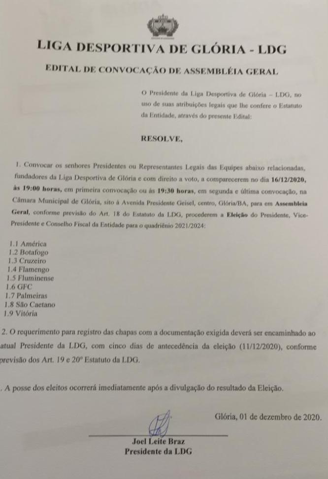 Após longos anos sem eleições, a LDG-Liga Desportiva de Glória Bahia presidida pelo senhor Joel Leite Braz abre Edital de Convocação de Assembleia Geral em 16 de dezembro de 2020 as 19h30min, a fim de eleger sua nova diretoria. Apenas os presidentes e representantes legais dos clubes associados tem direito a voto.