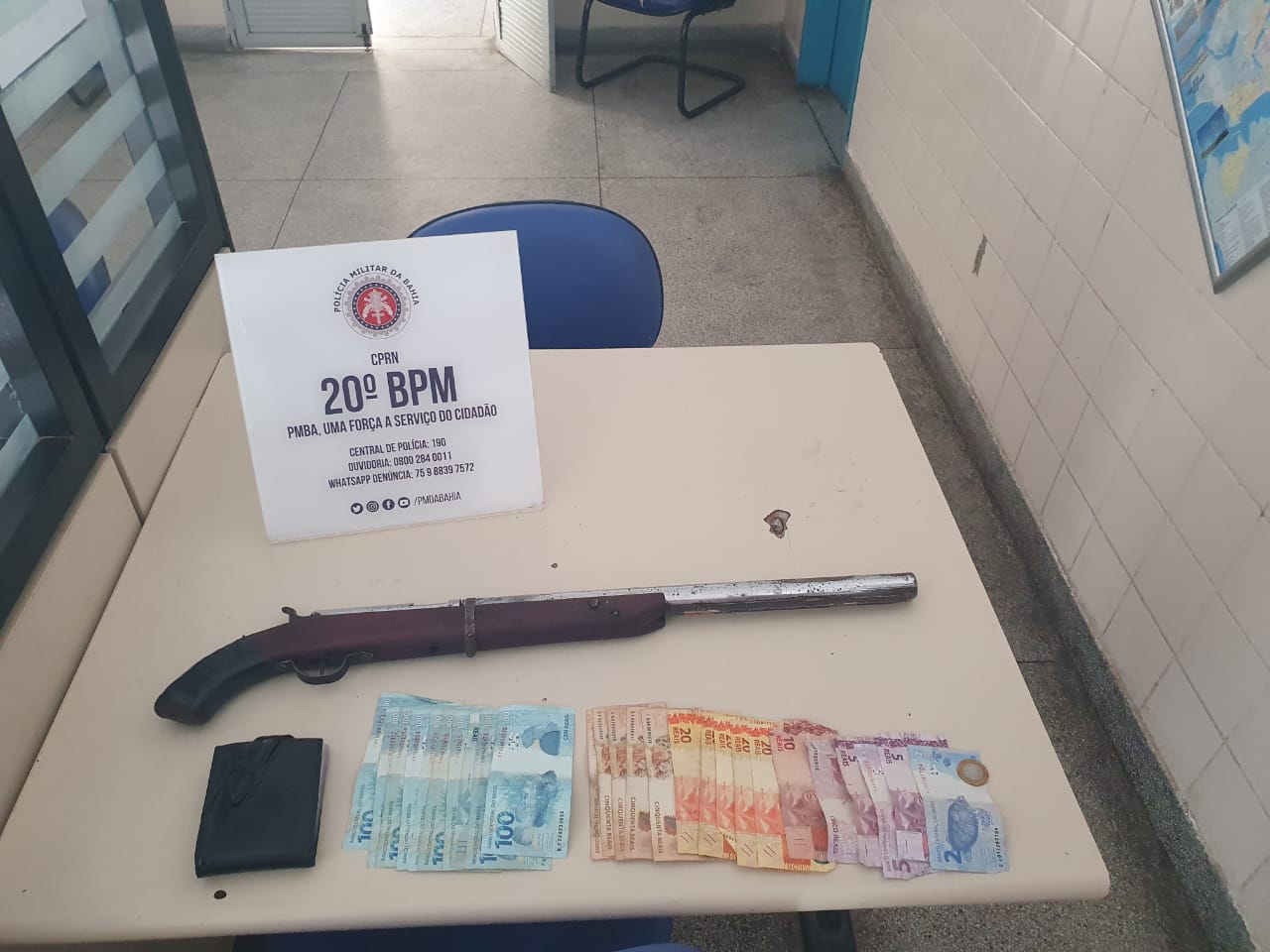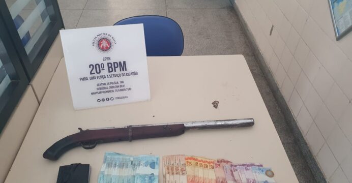 MATERIAL APREENDIDO: 01 (uma) espingarda de fabricação caseira e 1383 (um mil trezentos e oitenta e três reais) em cédulas.