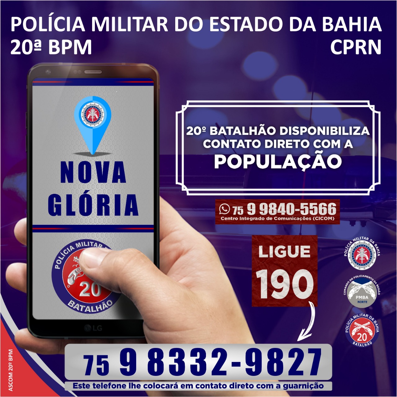 20º Batalhão de Policia Militar da Bahia está disponibilizando um Contato Direto com a população da cidade de Gloria Bahia através do numero 75-99840-5566. Nesse numero os munícipes entrarão em Contato Direto com as Guarnições da 5ª CIA-PM.