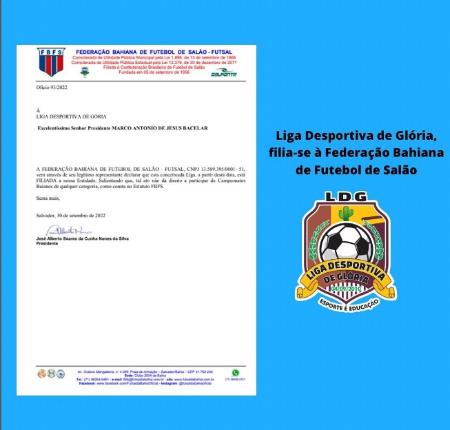 O presidente da Liga Desportiva de Glória, Dr. Marco Bacelar comemora a filiação da LDG à Federação Baiana de Futebol de Salão. “Com muita alegria comunico ao desportista gloriense que a Liga Desportiva de Glória está filiada à Federação Baiana de Futebol de Salão”.
