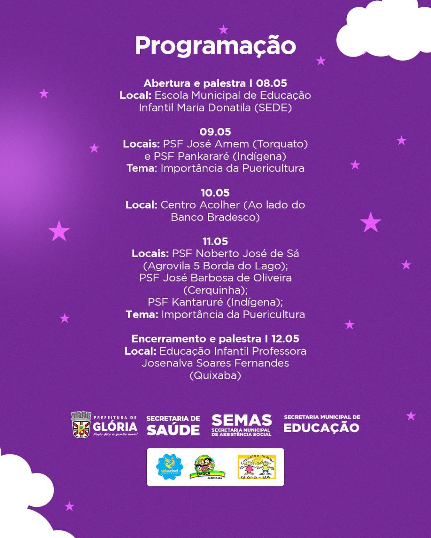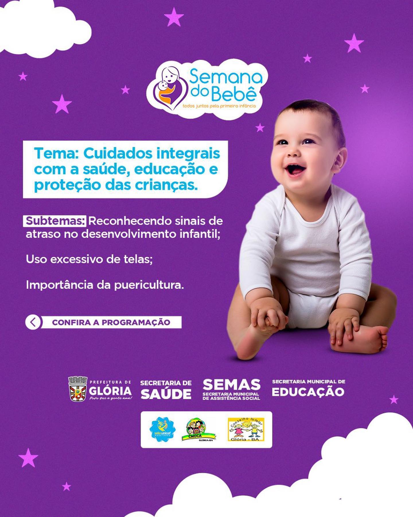 A Prefeitura Municipal Glória Bahia, através da Comissão da Semana do Bebê, convida toda a população gloriense para participar das atividades da Semana do Bebê, que acontece nos dias 08 a 12 de maio de 2023, a partir das 08:30, cujo tema central é: “Cuidados Integrais com a Saúde, Educação e Proteção das Crianças”.