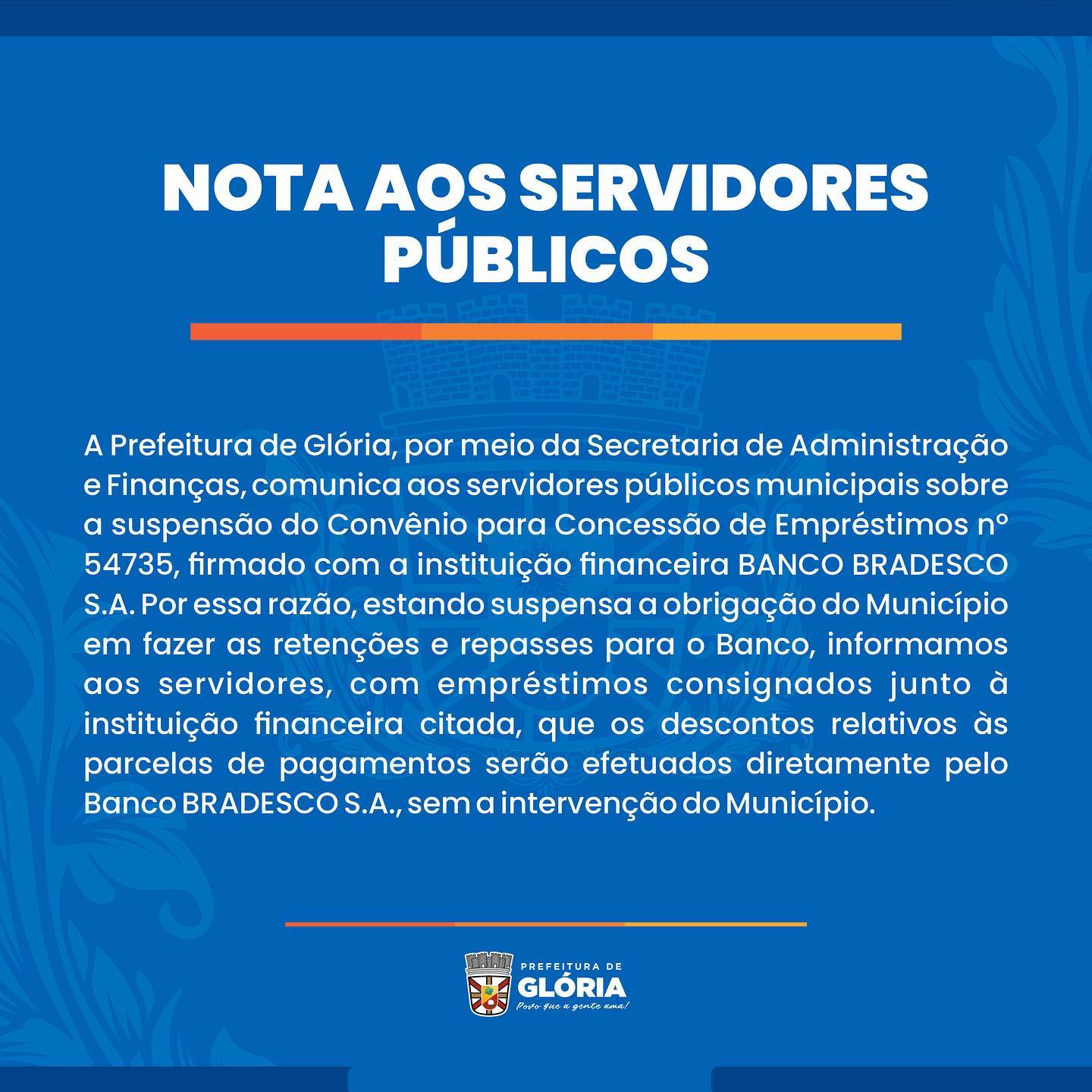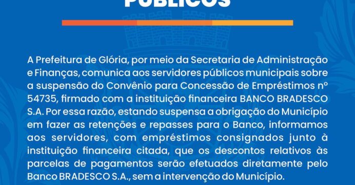 Em virtude da suspensão do convênio de empréstimo consignado com o Banco Bradesco S.A., o desconto relativo à parcela, porventura existente, será efetuado na conta do servidor diretamente pelo Banco.
