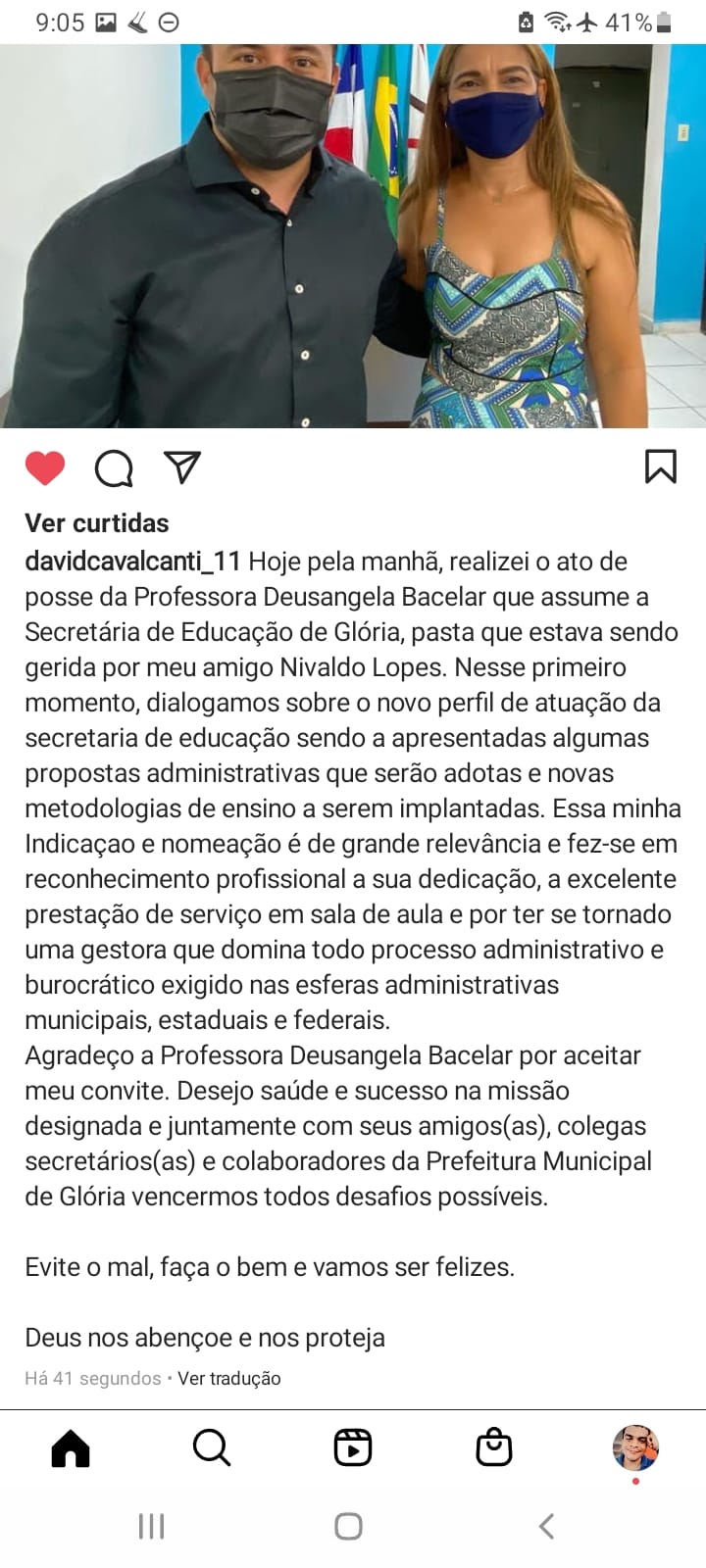 O prefeito da cidade de Glória Bahia David Cavalcanti-Progressistas resolveu realizar mudanças da gestão da Secretaria Municipal de Educação. A professora Deusângela Campos Nunes Bacelar assumiu a secretaria no dia 02 de fevereiro de 2022, já o ex-secretário Nivaldo Lopes de Moraes foi recambiado para a Ouvidoria do Município.