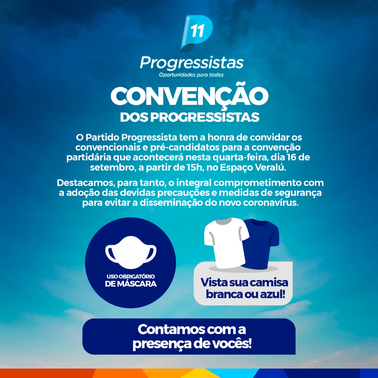 O covite é direcionado aos convencionais que disputarão as eleições de prefeito, vice e vereadores e filiados dos Progressistas. A participação terá um público limitado devido a pandemia do Coronavírus.