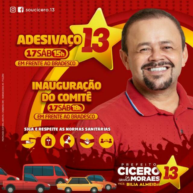 O ADESIVAÇO 13 acontecerá em frente ao Comitê de Cícero Moraes e Bilia localizado na sede do município em frente ao BRADESCO.