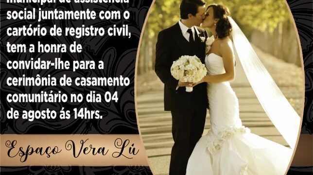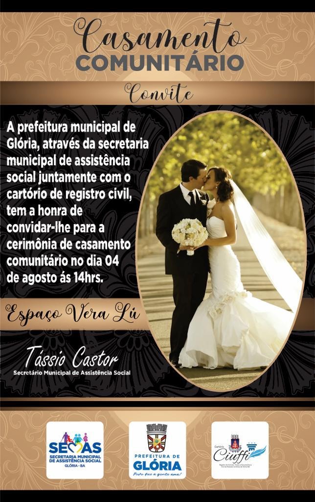 A Prefeitura Municipal de Glória (BA), através da Secretaria Municipal de Assistência Social, juntamente com o Cartório Civil de Pessoas Naturais, realizará na sexta-feira, 04 de agosto de 2023, as 14h, no Espaço Vera Lú, cerimônia de Casamento Comunitário Civil de casais glorienses, cadastrados no CadÚnico.