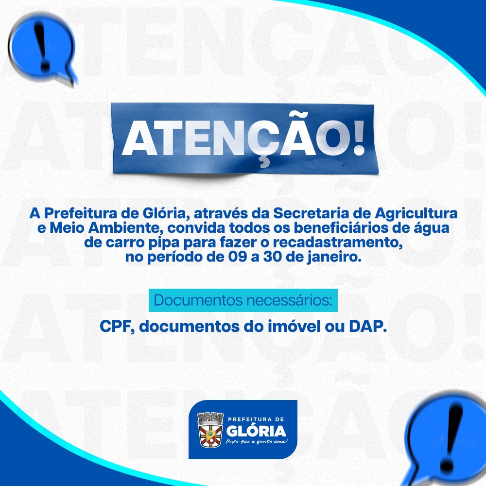 A Prefeitura Municipal de Glória Bahia, através da Secretaria de Agricultura e Meio Ambiente, convida todos os beneficiários de água de carro pipa para fazerem o recadastramento, no período de 09 a 30 de janeiro de 2023.