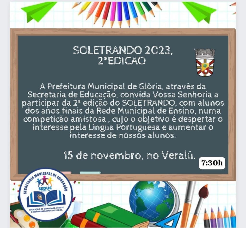 A Prefeitura Municipal de Glória Bahia, através da Secretaria Municipal de Educação, realizará a 2ª Edição do Projeto Soletrando, nesta quarta-feira, 15 de novembro de 2023, no Espaço VERALÚ, na sede do município, a partir das 07h, com alunos das séries finais da Rede Municipal de Ensino, numa competição amistosa, cujo o objetivo é despertar o interesse pela Língua Portuguesa e aumentar o foco dos alunos.