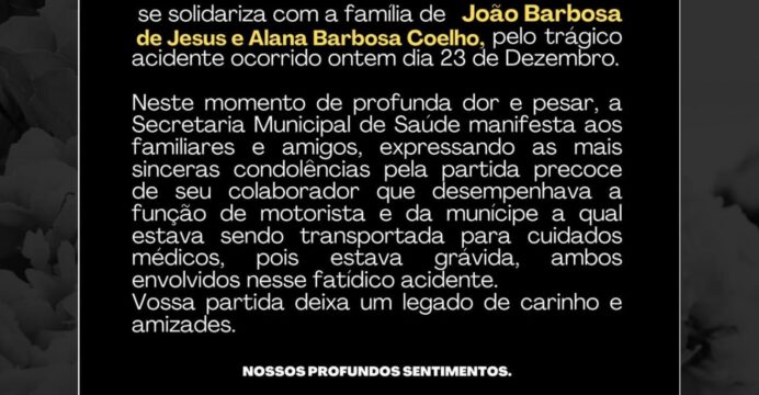 A Secretaria Municipal de Saúde, se solidariza com a família de João Barbosa de Jesus e Alana Barbosa Coelho, pelo trágico acidente ocorrido ontem dia 23 de Dezembro.