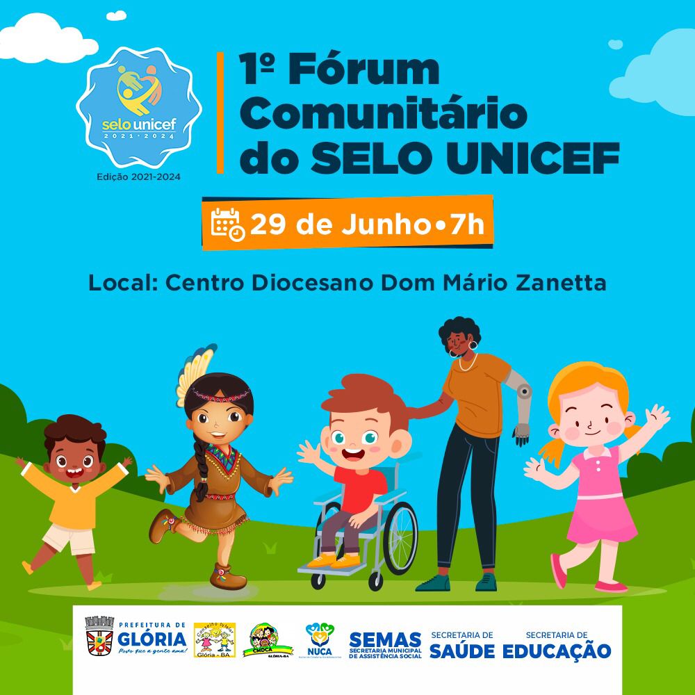 A Prefeitura Municipal de de Glória Bahia convida toda a população para participar do 1° Fórum Comunitário do Selo Unicef, edição 2021-2024, que será realizado na próxima quarta-feira, 29 de junho de 2022, no Centro Diocesano Dom Mário Zanetta.
