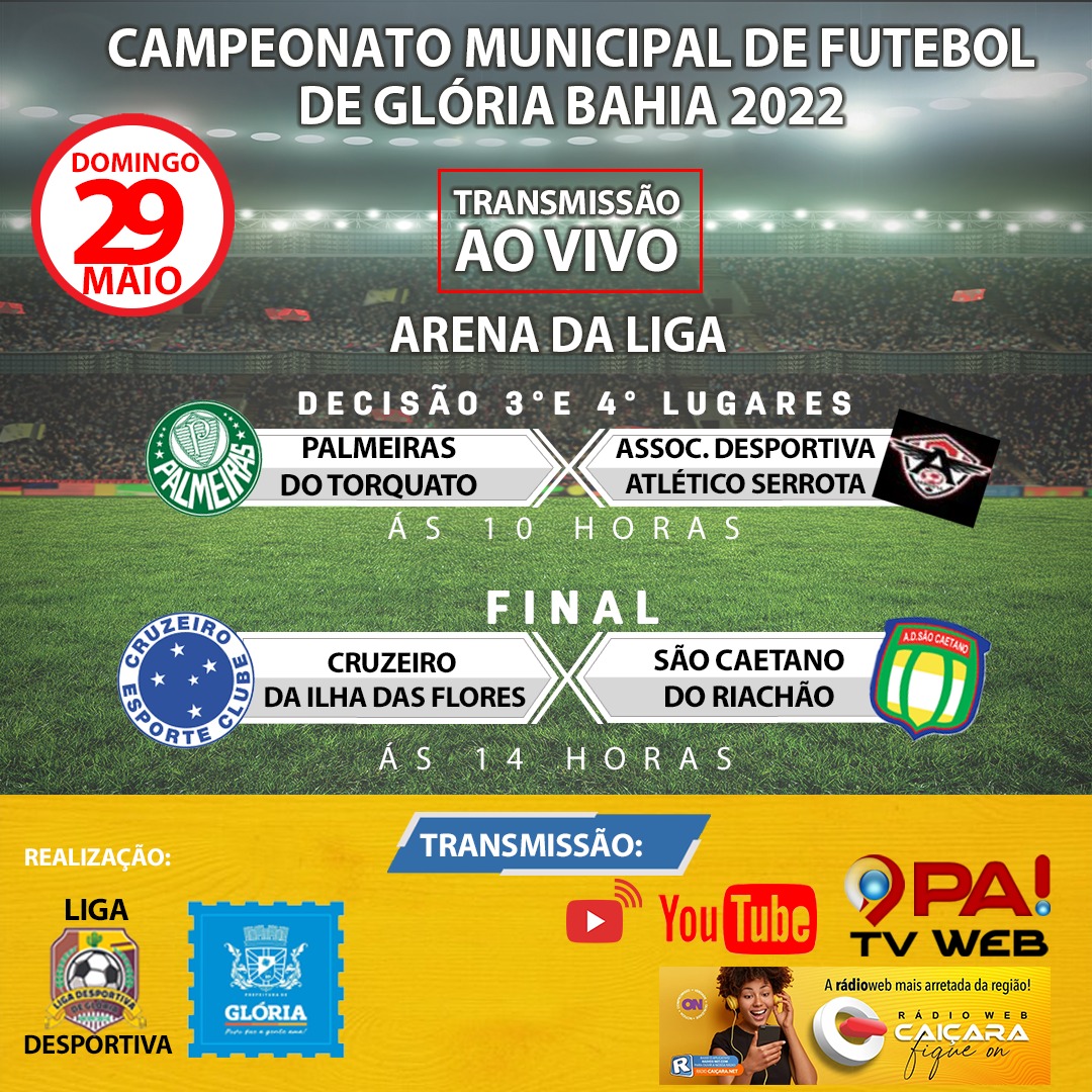 Domingo 29 de maio de 2022 acontece na Arena da Liga, acontece a final do Campeonato Municipal de Futebol de Glória Bahia. A decisão do terceiro e quarto lugar terá início às 10h, após o jogo música ao vivo. Às 14h acontece a decisão do primeiro e segundo lugar, em seguida música ao vivo.
