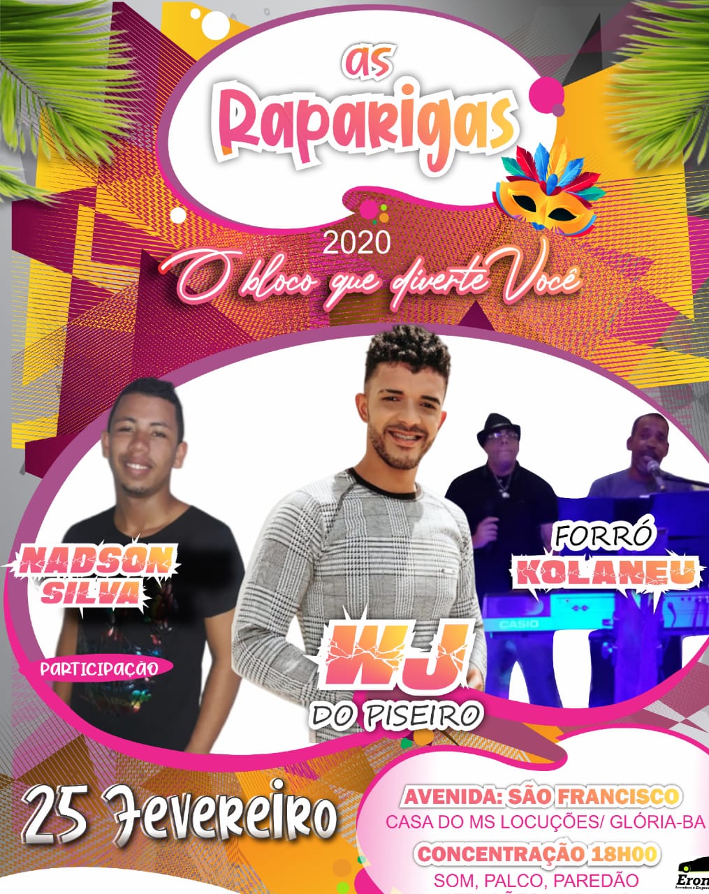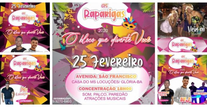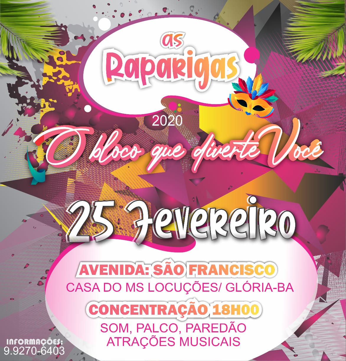 Já está tudo preparado para a grande festa de Momo de Glória Bahia, Carnaval 2020 é no Bloco “As Raparigas” que acontece dia 25 de fevereiro. A concentração acontece a partir das 18h na Avenida São Francisco em frente a Casa do MS Locuções.