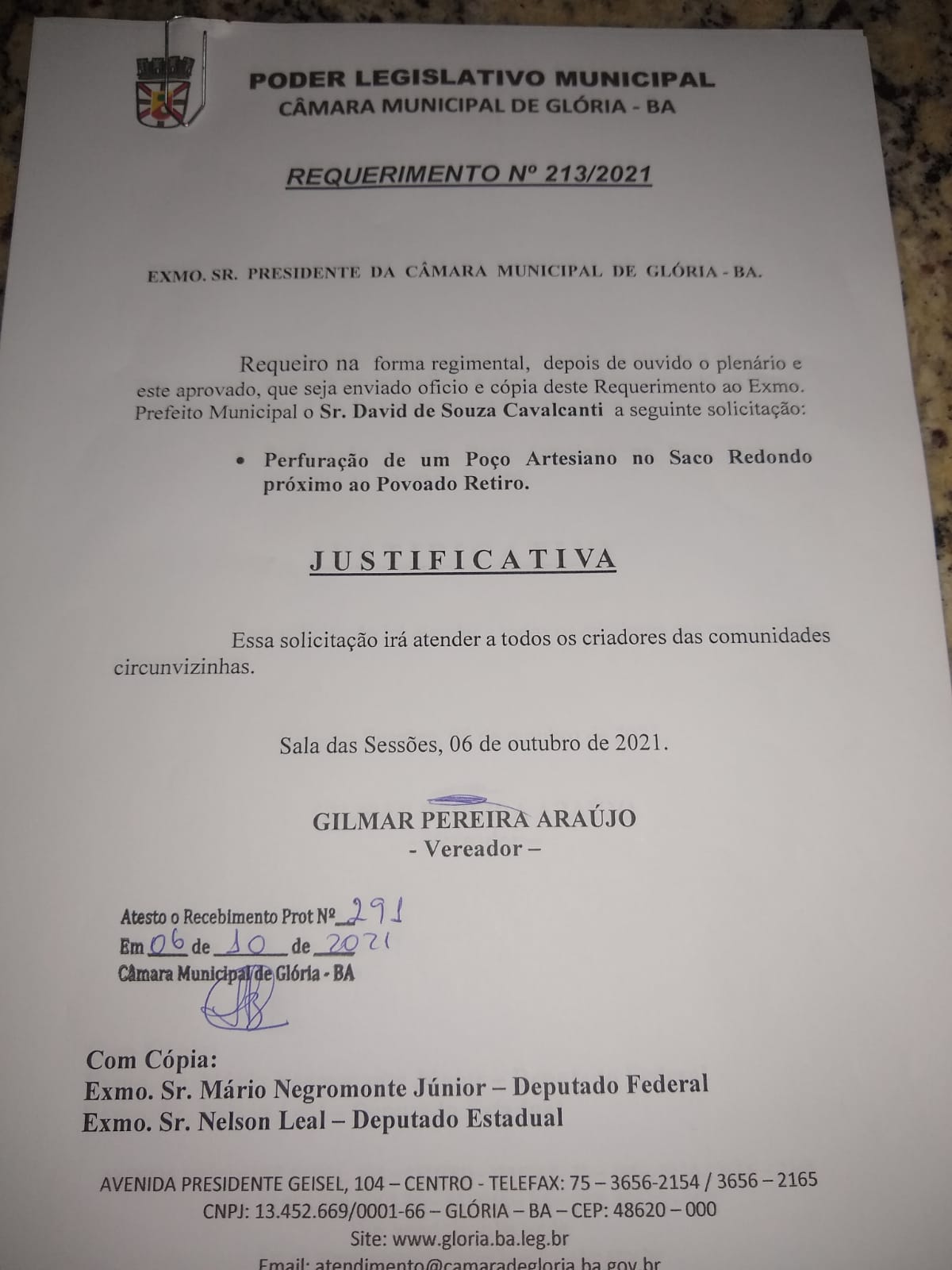 O Vereador Gilmar Pereira Araújo-Progressistas deu entrada com um Requerimento Número 213/2021 na Câmara Municipal de Vereadores da cidade de Glória Bahia, solicitando Perfuração de Poço Artesiano no Povoado Retiro. Na justificativa o Vereador Gilmar Pereira diz que essa solicitação irá atender além do Povoado Retiro, todas as comunidades circunvizinhas.