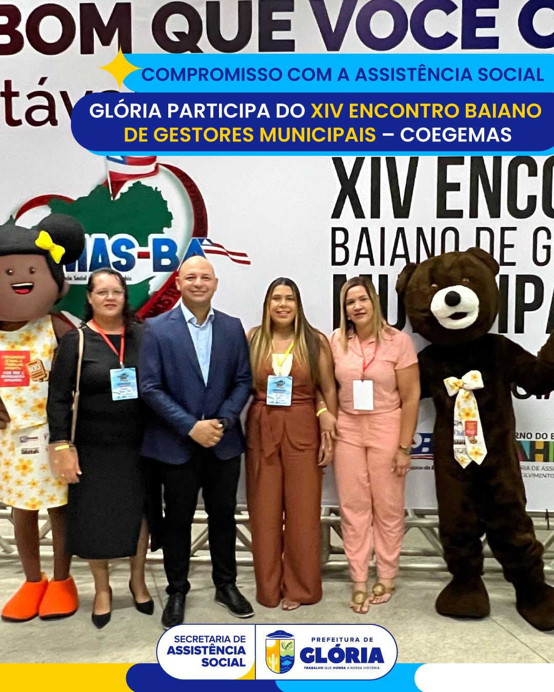 A Prefeitura de Glória, por meio da Secretaria Municipal de Assistência Social, marcou presença no XIV Encontro Baiano de Gestores Municipais de Assistência Social – promovido pelo COEGEMAS –, realizado nos dias 02, 03 e 04 de abril, na Universidade Federal do Sul da Bahia, em Porto Seguro. O evento celebrou os 20 anos do Sistema Único de Assistência Social (SUAS), reunindo gestores, técnicos e profissionais da área de todo o estado.