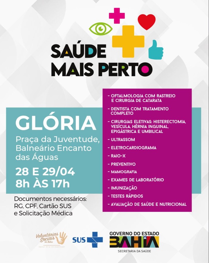 A Prefeitura Municipal de Glória Bahia através do prefeito David Cavalcanti vai sediar o Programa “Saúde Mais Perto”, uma parceria entre Governo do Estado da Bahia e o município, onde levam várias especialidades médicas para atendimento da população. Na cidade de Glória a ação acontece nos dias 28 e 29 de abril de 2023, no Balneário Encanto das Águas das 08h as 17h.
