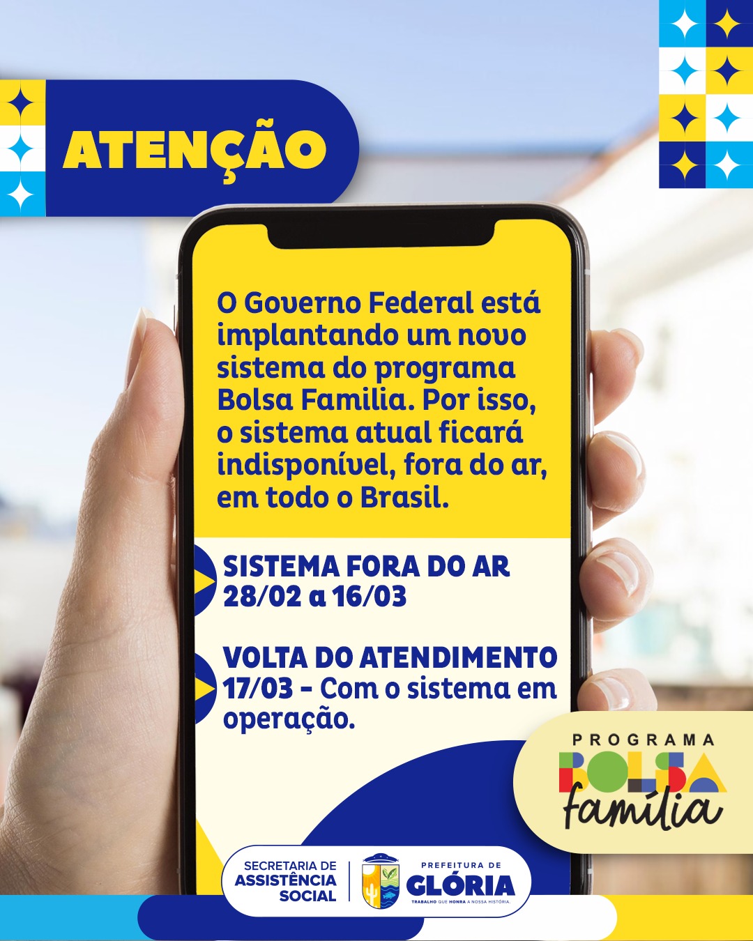 A Prefeitura de Glória, por meio da Secretaria de Assistência Social, informa à população que o Governo Federal está implantando um novo sistema para o programa Bolsa Família. Durante esse processo de atualização, o sistema atual ficará fora do ar em todo o Brasil, impossibilitando atendimentos e consultas temporariamente.