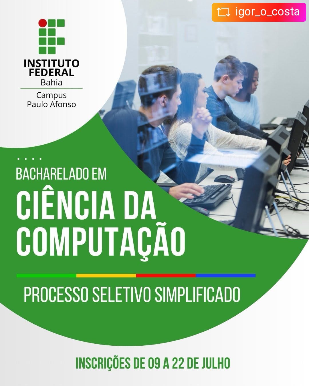 O IFBA Paulo Afonso anuncia a abertura do Curso de Bacharelado em Ciência da Computação, ofertado pela primeira vez no campus, fortalecendo a presença do ensino superior em tecnologia na região.