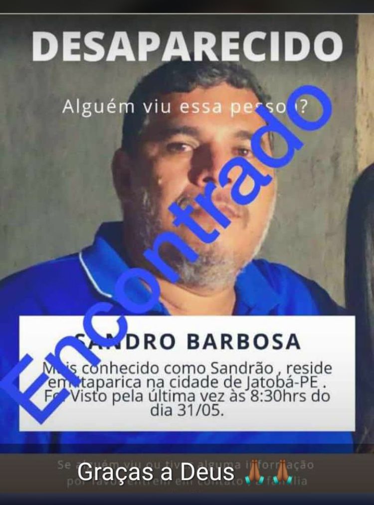O ex-vereador de Jatobá Pernambuco Sandro Barbosa, popular Sandrão, foi localizado no início da tarde desta quinta-feira 02 de junho de 2022 no município de Delmiro Gouveia Estado de Alagoas. Sandrão estava desaparecido desde do dia 31 de maio de 2022, após de 48 horas ele foi entrado devido as redes sociais.