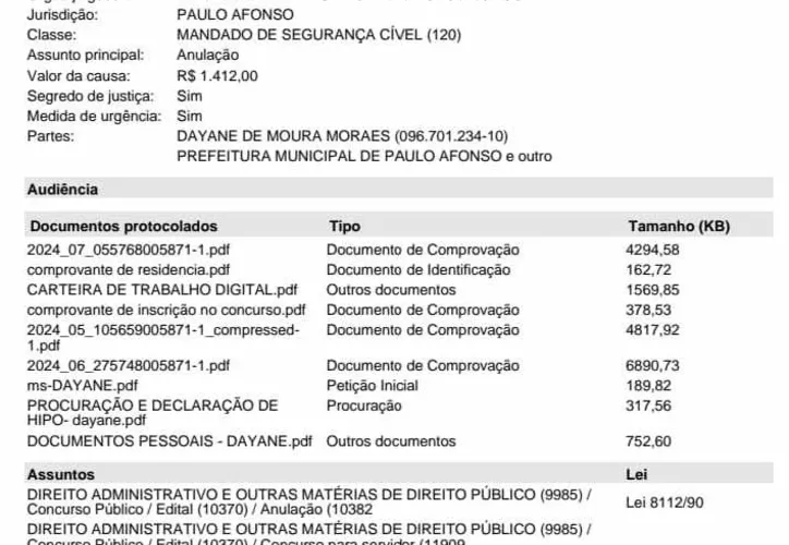 Um mandado de segurança foi impetrado na 1ª Vara da Fazenda Pública de Paulo Afonso. De acordo com a denúncia, “houve atraso na divulgação do resultado final; falta de divulgação das notas e dos prazos para interposição de recursos”, disse Onilde Carvalho.