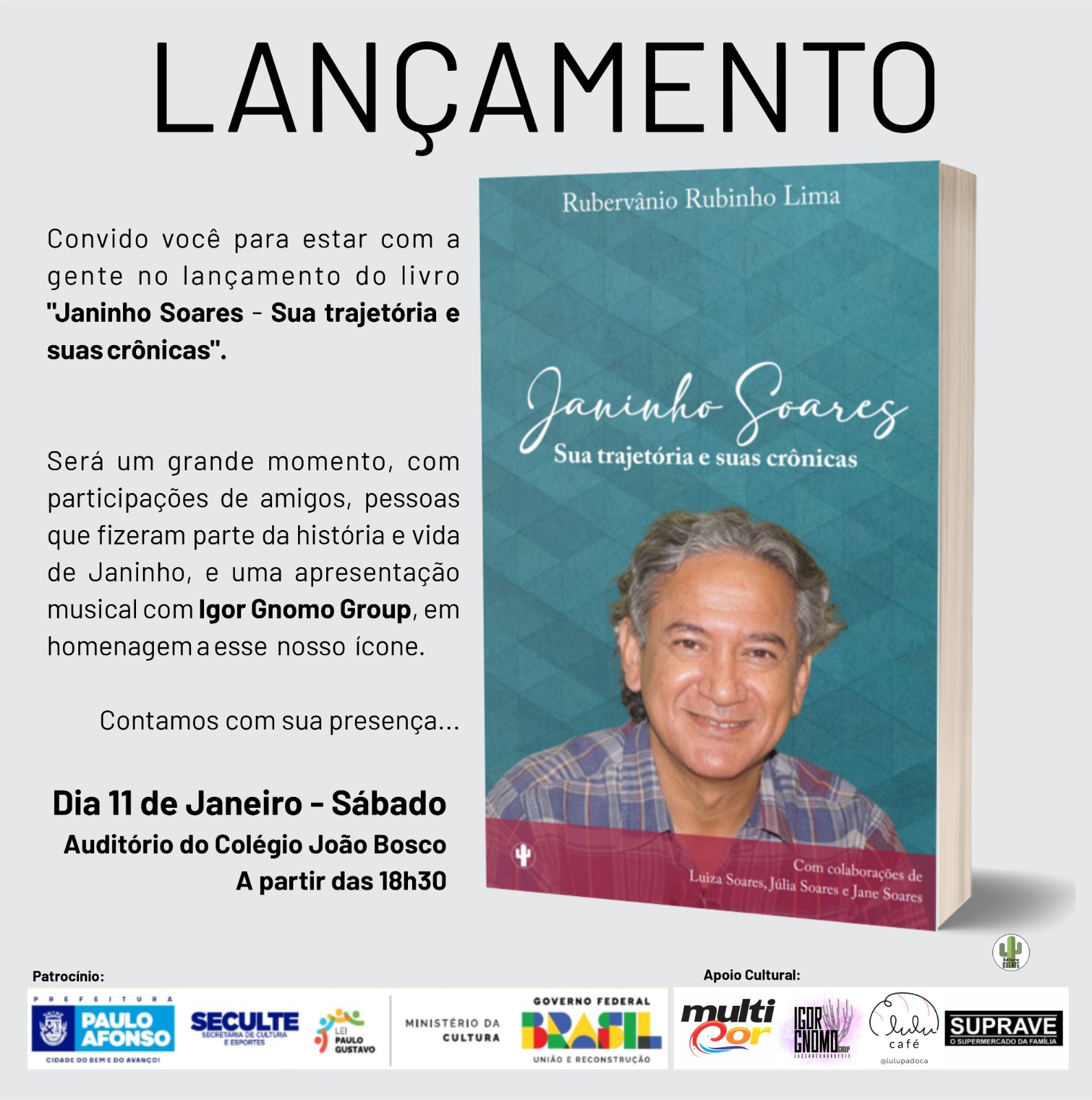 Com participação de amigos, pessoas queridas, que conviveram com Janinho e com atrações musicais tais como @igor.gnomo, @silvinhoxavier e muitas homenagens. Não percam! Local: Auditório do Colégio João Bosco dia 11 de Janeiro | 18h30