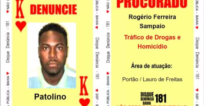 De acordo com a SSP, “Patolino” estava envolvido em diversos crimes, incluindo tráfico de drogas e armas, homicídios, roubos, porte ilegal de arma de fogo e corrupção de menores. Foragido da Justiça, ele foi encontrado após ações de inteligência indicarem seu esconderijo em Aracaju.