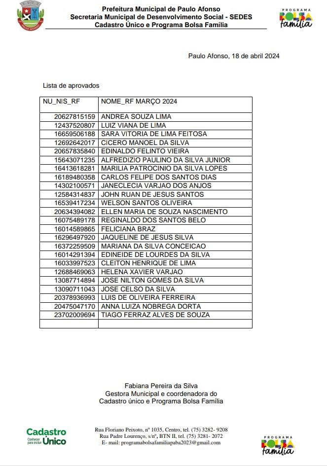 O Governo Federal divulgou a nova lista dos contemplados de Paulo Afonso pelo Programa Bolsa Família para o mês de abril. Essa relação atualizada está agora disponível para consulta pública através de diversos meios, facilitando o acesso dos cidadãos às informações.