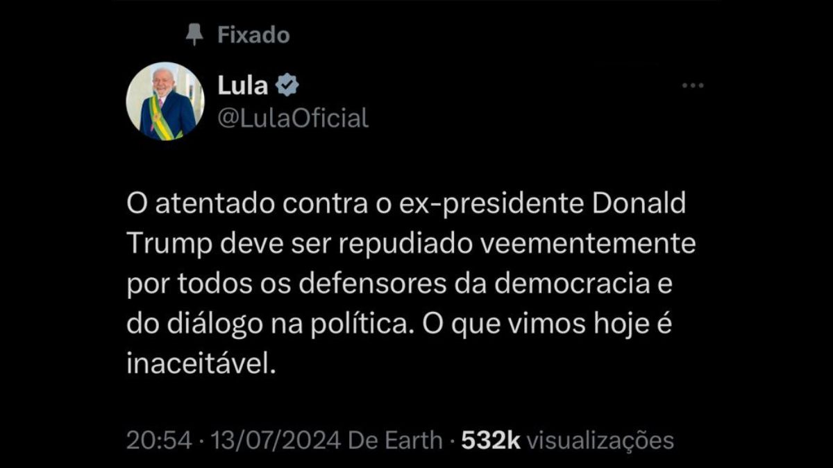 Em suas redes sociais, Lula afirmou que o atentado ocorrido neste sábado (13) é inaceitável.