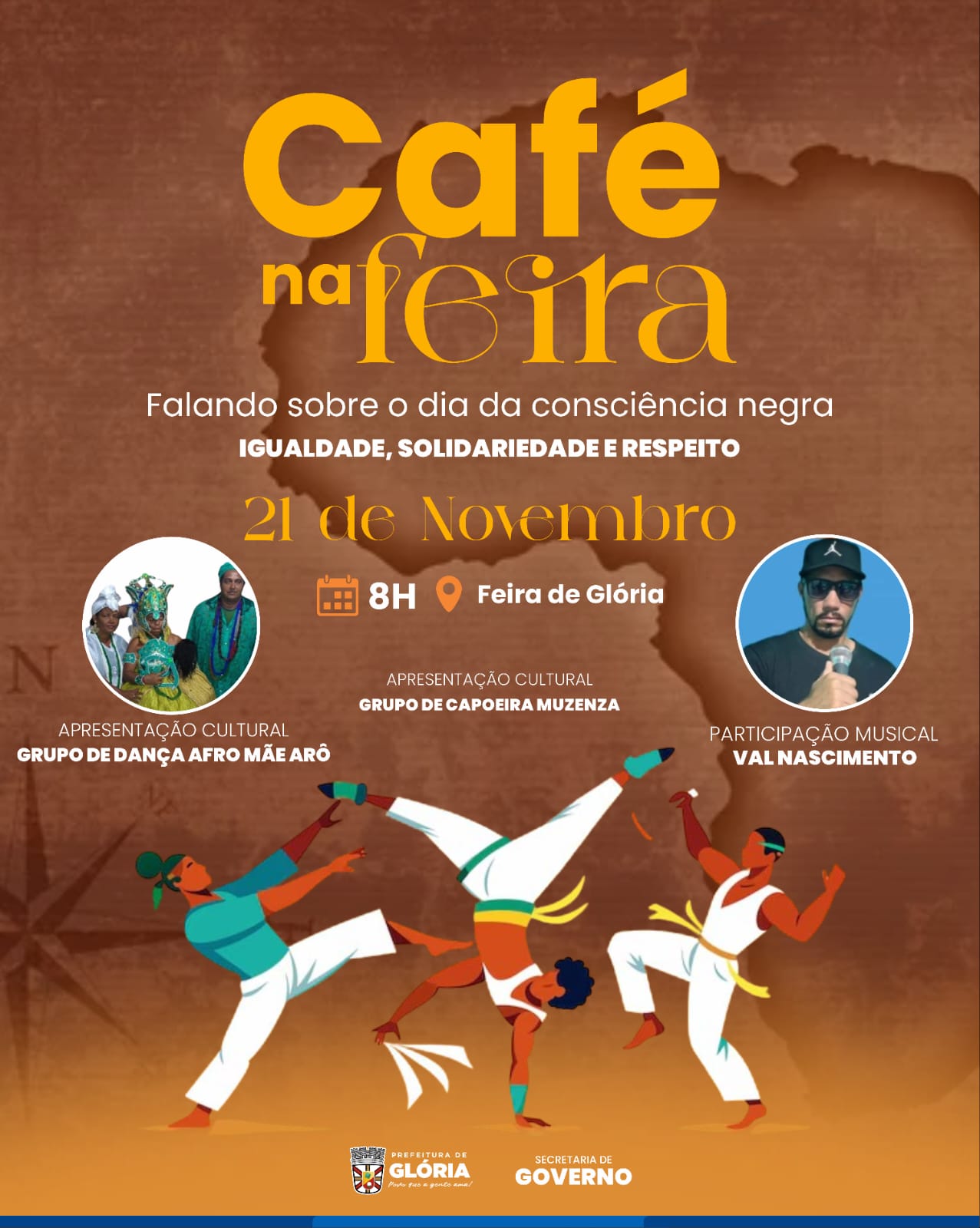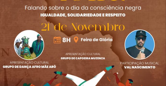 O evento contará com a emocionante apresentação cultural do Grupo de Dança Afro Mãe Arô, da Capoeira Muzenza e do cantor gloriense Val Nascimento, celebrando a cultura negra e a importância desta data na luta contra o racismo e pela igualdade.