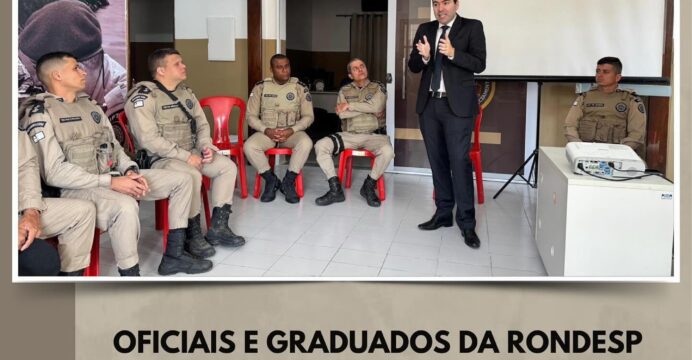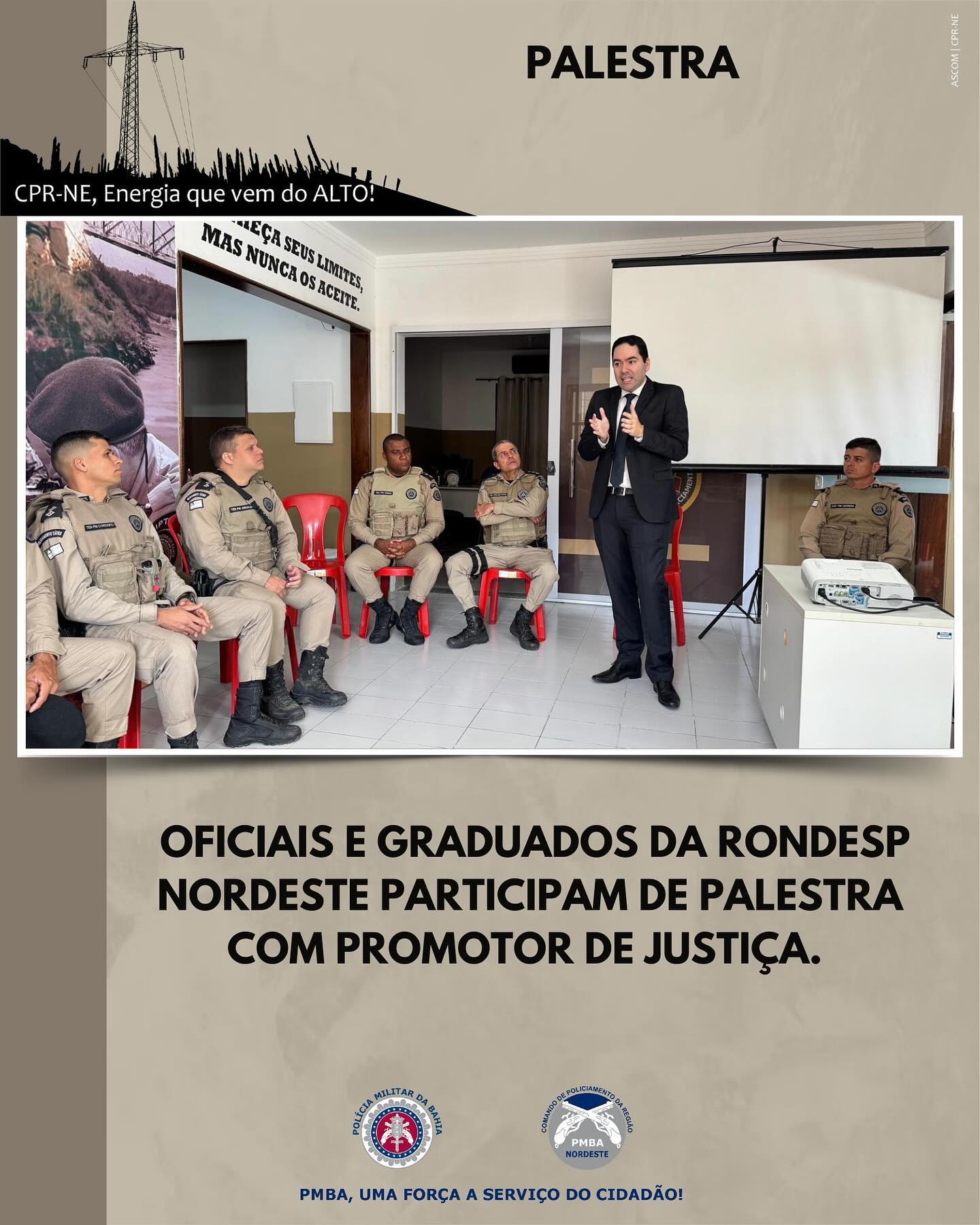 O Promotor de Justiça Fernando Rogério proferiu uma Palestra sobre os Aspectos Jurídicos da Atuaçaõ Policial aos Oficiais e Graduados da Rondesp Nordesp, na qual também se fez presente o Comandante de Policiamento da Região Nordeste, Cel PM Mattos. Na palestra foram tratados temas como Abordagem Policial, Direitos Humanos e do cidadão.