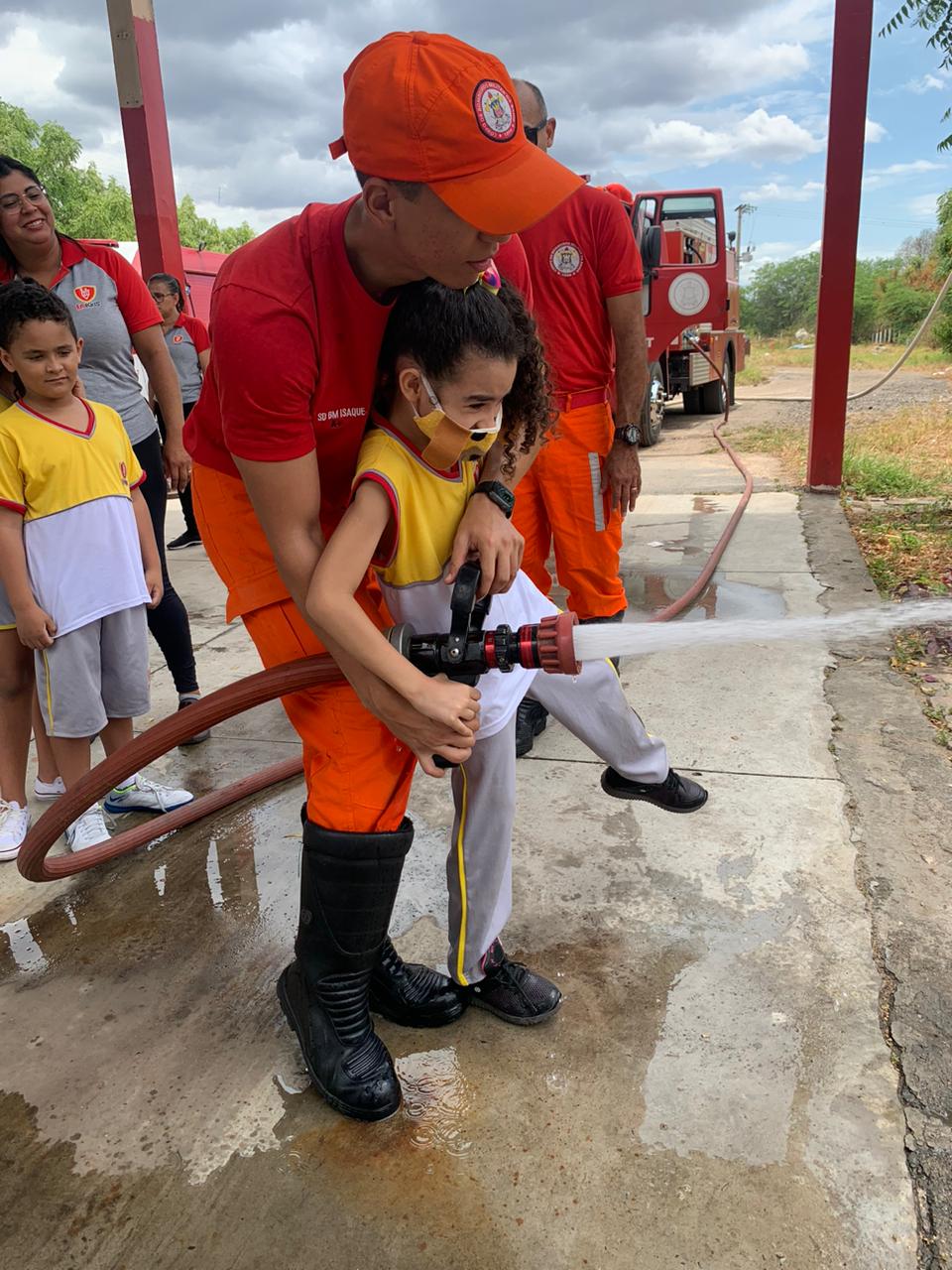 Na ocasião, os bombeiros militares também efetuaram uma demonstração de como é feita a extinção do fogo com a viatura, demonstrando por meio de uma linha de defesa.