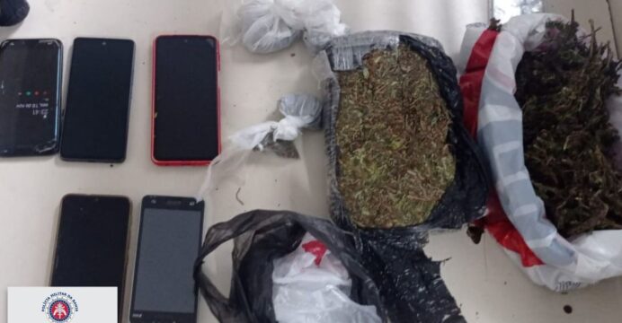 Na oportunidade, foi feita a apresentação do seguinte material: 2 kg material análogo à maconha 4 pedras de substância análoga à crack 5 aparelhos celulares R$ 124,00 em espécie