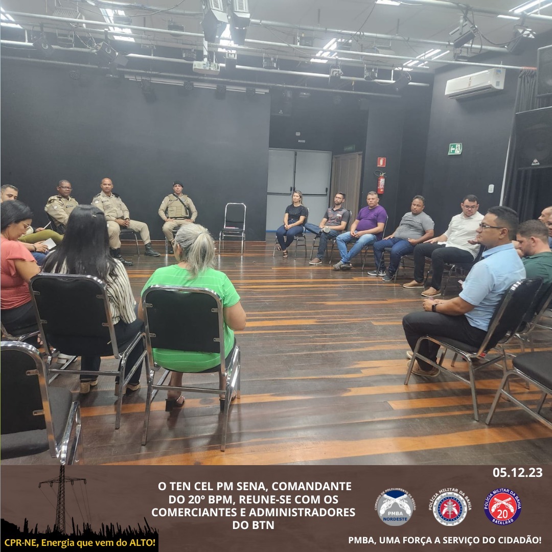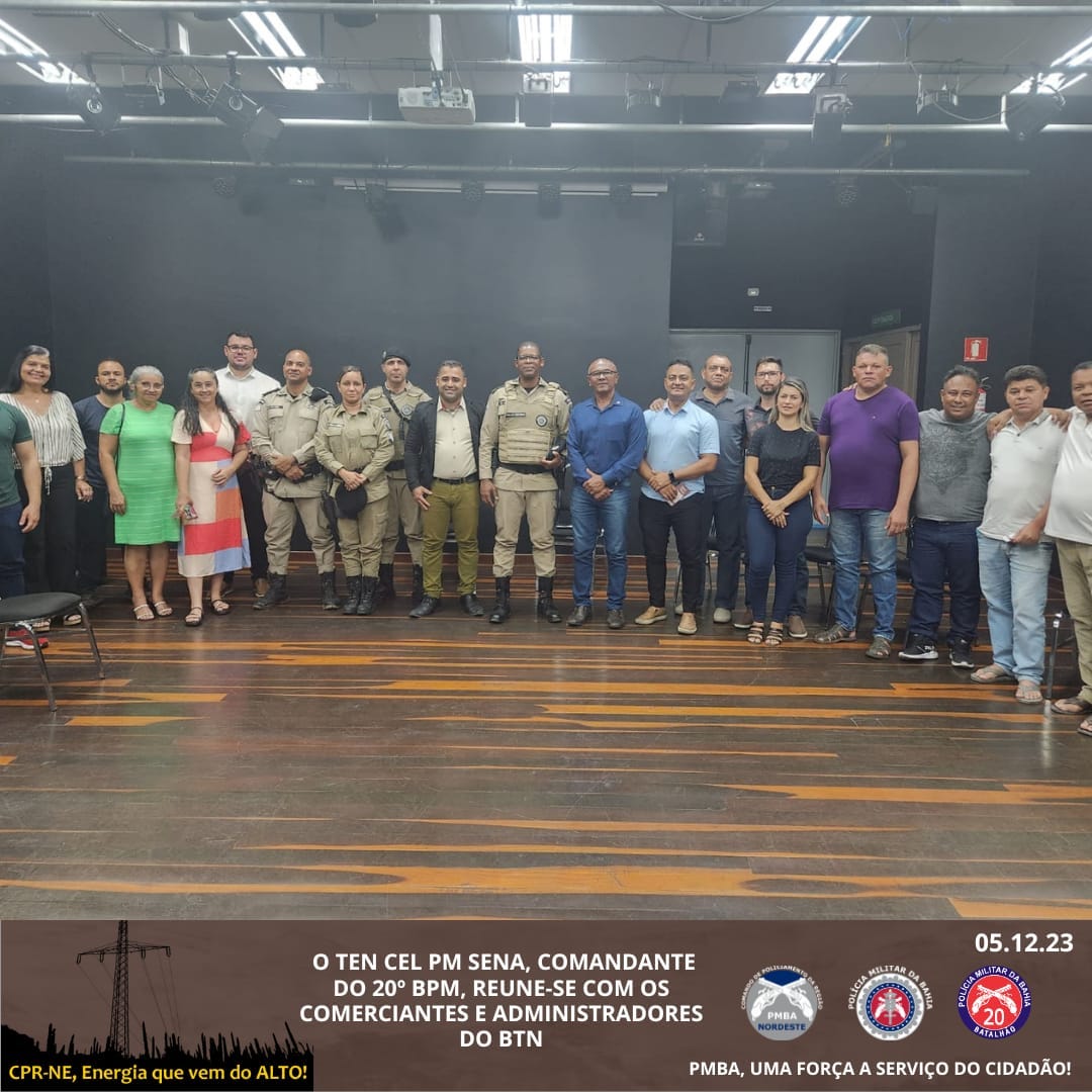 Ocorreu nesta terça-feira (05), a reunião envolvendo o 20º BPM, comandado pelo Ten Cel PM Sena, subordinado ao CPR-NE, comandado pelo Sr. Cel PM César Albuquerque, e os Comerciantes e Administradores do BTN. Estiveram presentes o Cap PM Rios, Coordenador de Planejamento Operacional, Cap PM Muniz, Comandante da 2ª Cia PP, Sr. Mivaldo Pereira da Silva, Presidente da CDL Paulo Afonso, Sr. Elislécio dos Santos Ferreira, Empresário e Líder dos comerciantes, Sr. Miguel Leite, Administrador do BTN, dentre outros representantes comerciais.