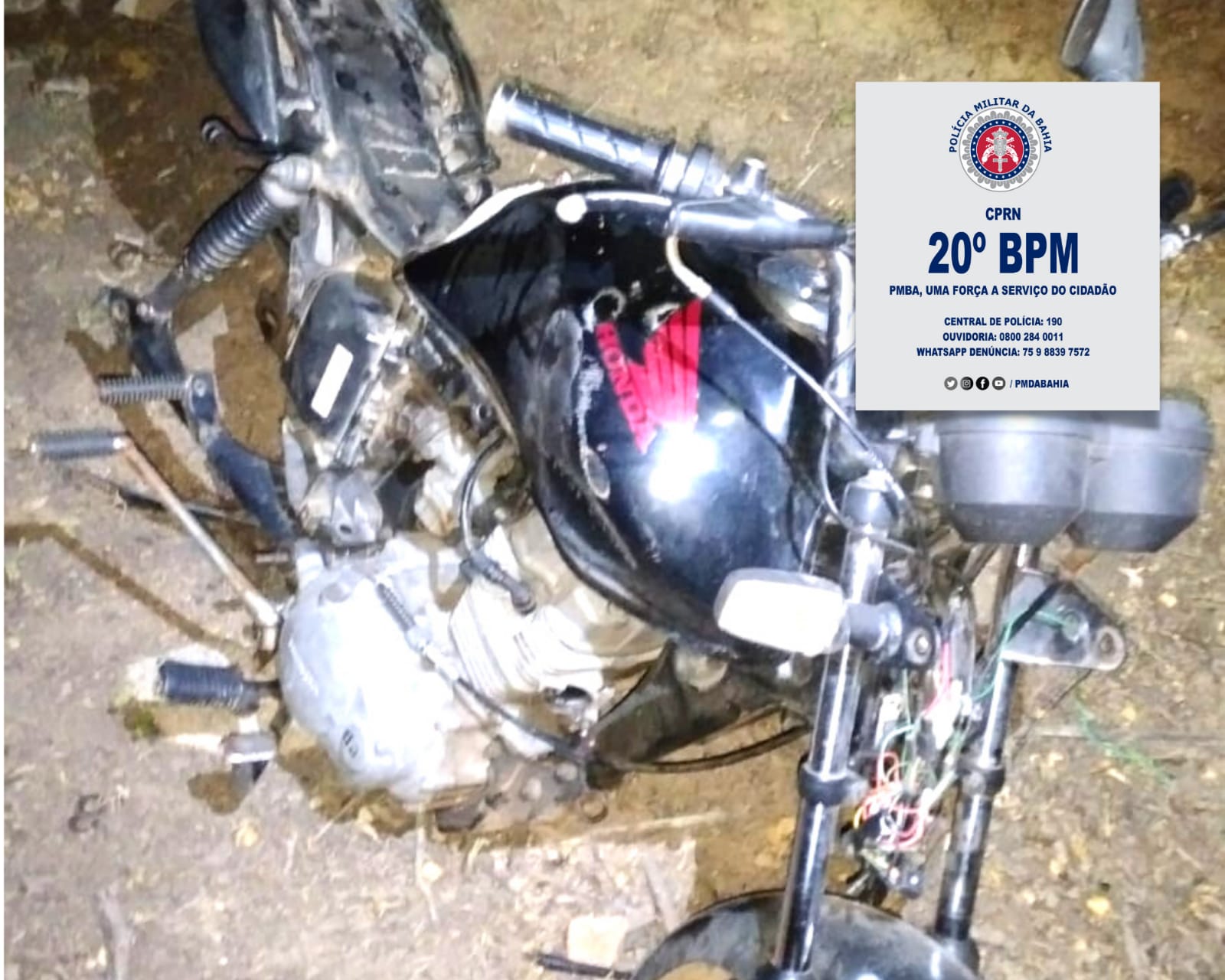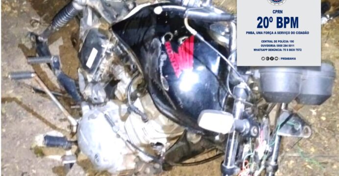 A Polícia Militar da Bahia (PMBA), através do 20º Batalhão de Polícia Militar (BPM/ Paulo Afonso-BA, Unidade Operacional comandada pelo Ten Cel PM Gabriel Neto, subordinada ao Comando de Policiamento da Região Norte (CPR-N), comandado pelo Coronel PM Valter Araújo, realizou , a recuperação de uma moto roubada em Paulo Afonso-BA, nesta quinta-feira (14), Por volta das 21:30 h, a guarnição foi acionada pelo CICOM, recebendo a determinação para deslocar ao Bairro Boa Esperança para averiguar uma situação de veículo abandonado.