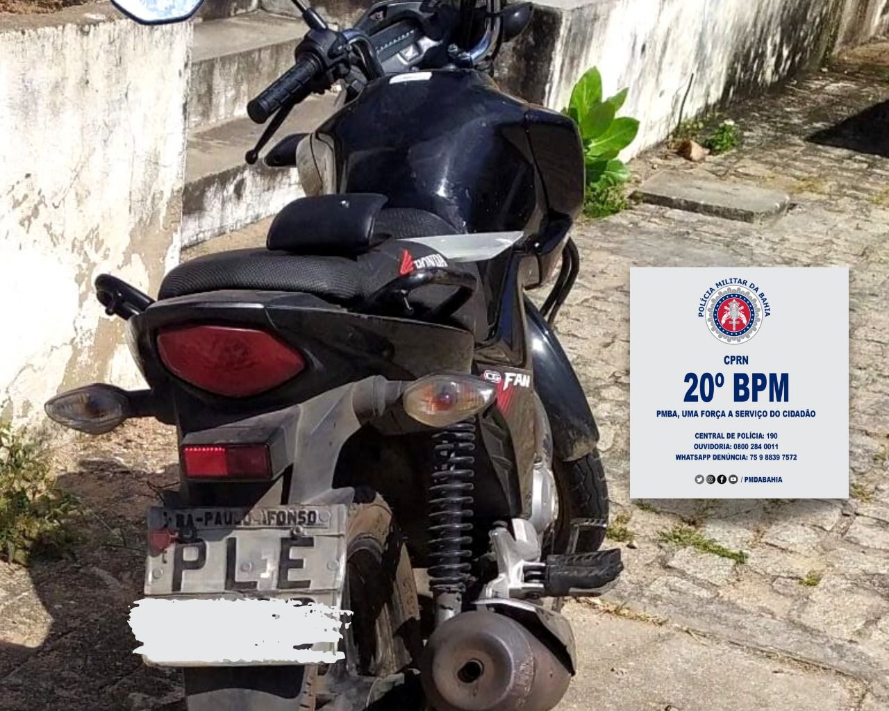 A Polícia Militar da Bahia (PMBA), através do 20º Batalhão de Polícia Militar (BPM/ Paulo Afonso-BA, Unidade Operacional comandada pelo Ten Cel PM Gabriel Neto, subordinada ao Comando de Policiamento da Região Norte (CPR-N), comandado pelo Coronel PM Valter Araújo recuperou, nesta terça-feira (04), uma motocicleta que havia sido abandonado após o cometimento de um homicídio.