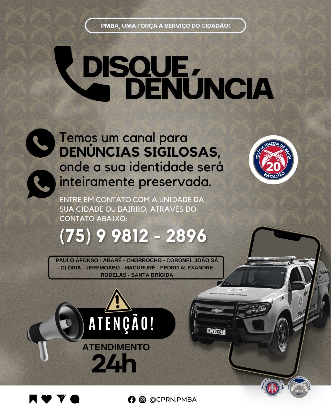 O 20º BPM-Batalhão de Polícia Militar da Bahia localizado na cidade de Paulo Afonso emitiu nota do novo número de contato da instituição para denúncias anônimas. Disque Denúncia do 20º BPM agora é 75-99812-2896 atendimento 24h.