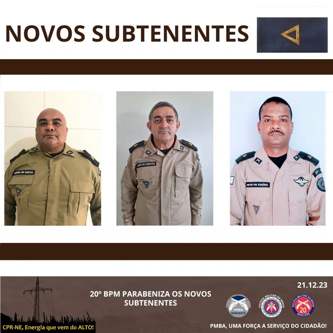 O 20⁰ BPM, comandado pelo Ten Cel PM Sena, parabeniza os novos Subtenentes pela promoção adquirida no dia 21/12. Foram promovidos à referida graduação os ST PM Arimatéia, ST PM Rogério e o ST PM Santos. O Ten Cel PM Sena, em nome de toda a tropa do 20⁰ BPM, teceu elogios aos recém promovidos, pelo profissionalismo e dedicação, além de desejar boa sorte nessa nova etapa.