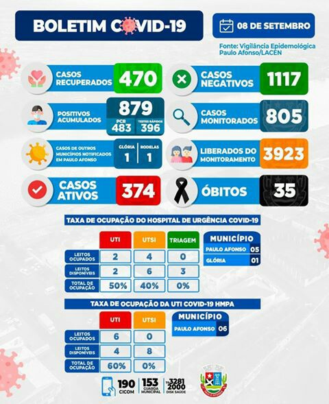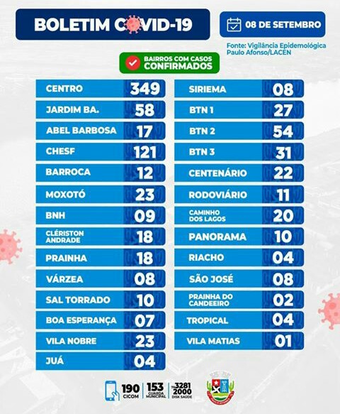 O Boletim Epidemiológico do Covid-19 emitido Pela Prefeitura Municipal de Saúde através da Secretaria Municipal de Saúde de Paulo Afonso Bahia em 08 de setembro de 2020 traz a seguinte informação:
