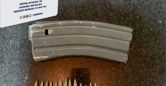 Foram apresentados na Delegacia de Paulo Afonso Bahia os seguintes materiais: Quatorze (14) munições de calibre 55.6, um, (01) carregador de fuzil e um (01) estojo de calibre 7.62.