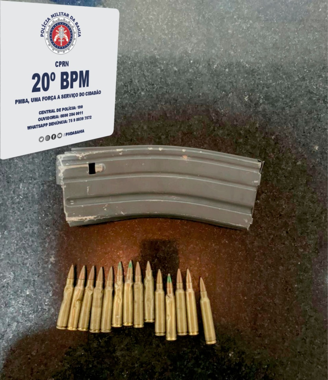 Hoje 28 de abril de 2021 por volta das 09h15min, foi entregue por adolescentes à guarnição da Viatura 8.2015, quatorze (14) munições de calibre 55.6, um (01) carregador de fuzil e um (01) estojo de calibre 7.62, que foram utilizados pelos assaltantes, no último dia 13/04/21, que tentaram roubar o carro-forte da empresa RENAFORTE, nas proximidades do povoado Itapicuru.