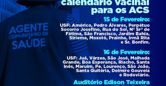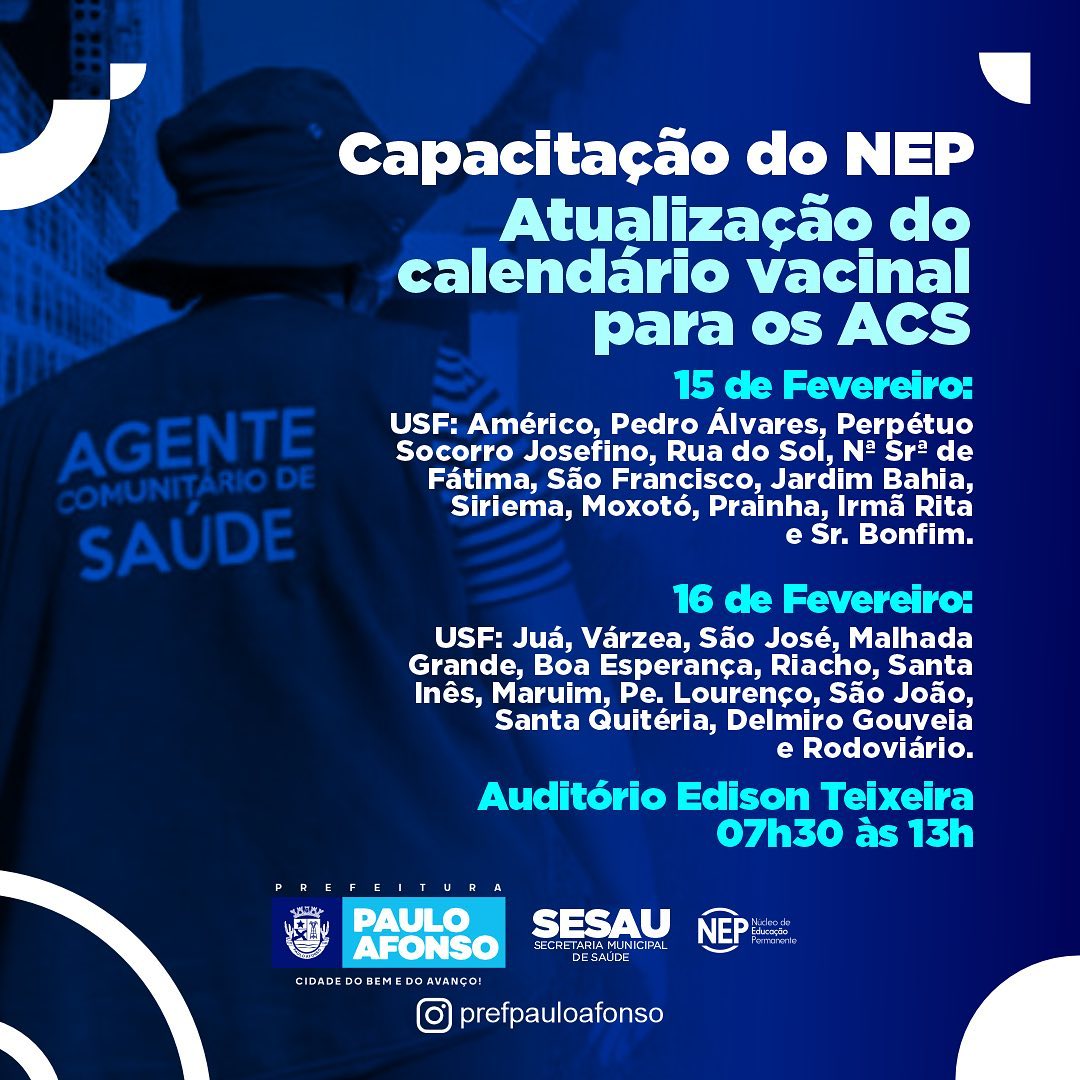 Para informar e atualizar os Agentes Comunitários de Saúde(ACS) sobre o calendário vacinal, a Secretaria de Saúde, por meio do Núcleo de Educação Permanente (NEP), estará realizando nos dias 15 e 16 de fevereiro uma capacitação para esse público.