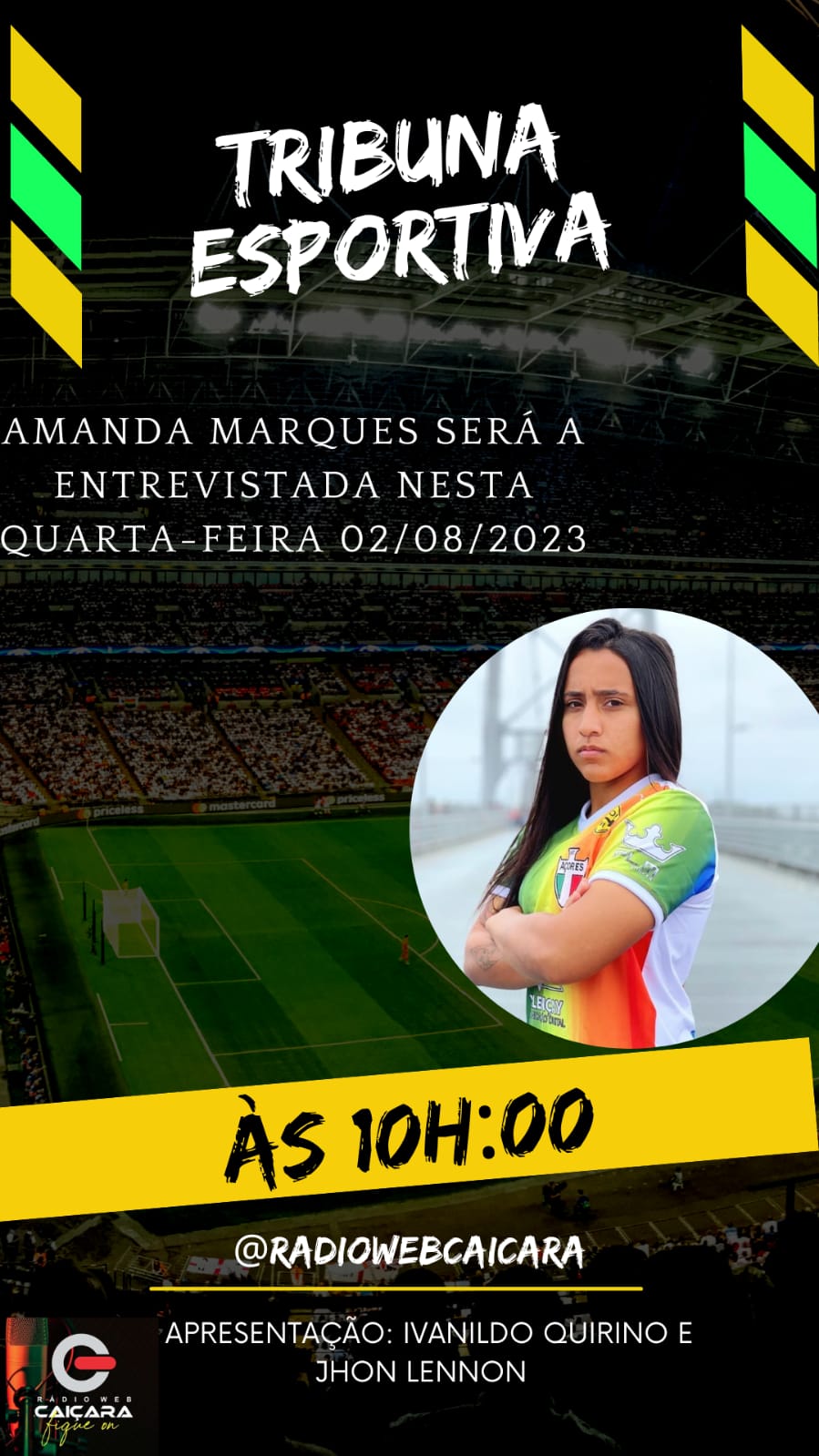 Nesta quarta-feira 02 de agosto de 2023 tem Amanda Marques no Programa Tribuna Esportiva da @radiowebcaicara a partir das 10h com Jhon Lenno e Ivanildo Quirino. O Programa Tribuna Esportiva vai ao ar de segunda a sexta-feira das 10h as 11h.
