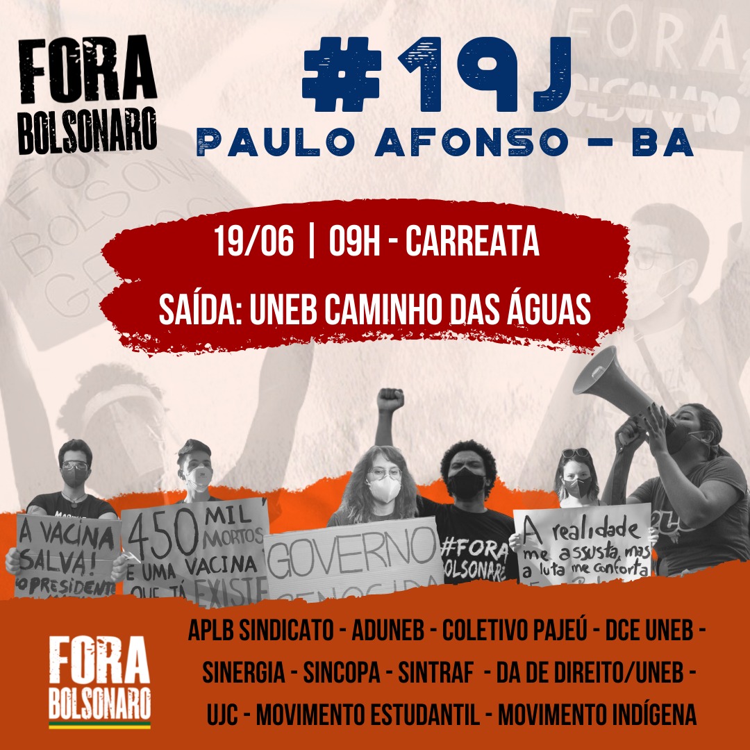 Acontece no próximo sábado, dia 19 de junho, às 9h da manhã o segundo ato Fora Bolsonaro. O coletivo formado por movimentos sociais, entidades de classe, militantes e simpatizantes realizará mais uma carreata pelas ruas de Paulo Afonso. A concentração será em frente a UNEB, próximo à igreja de São Francisco.