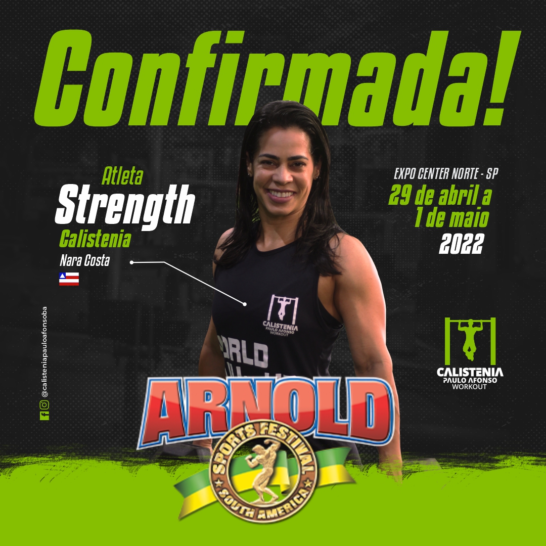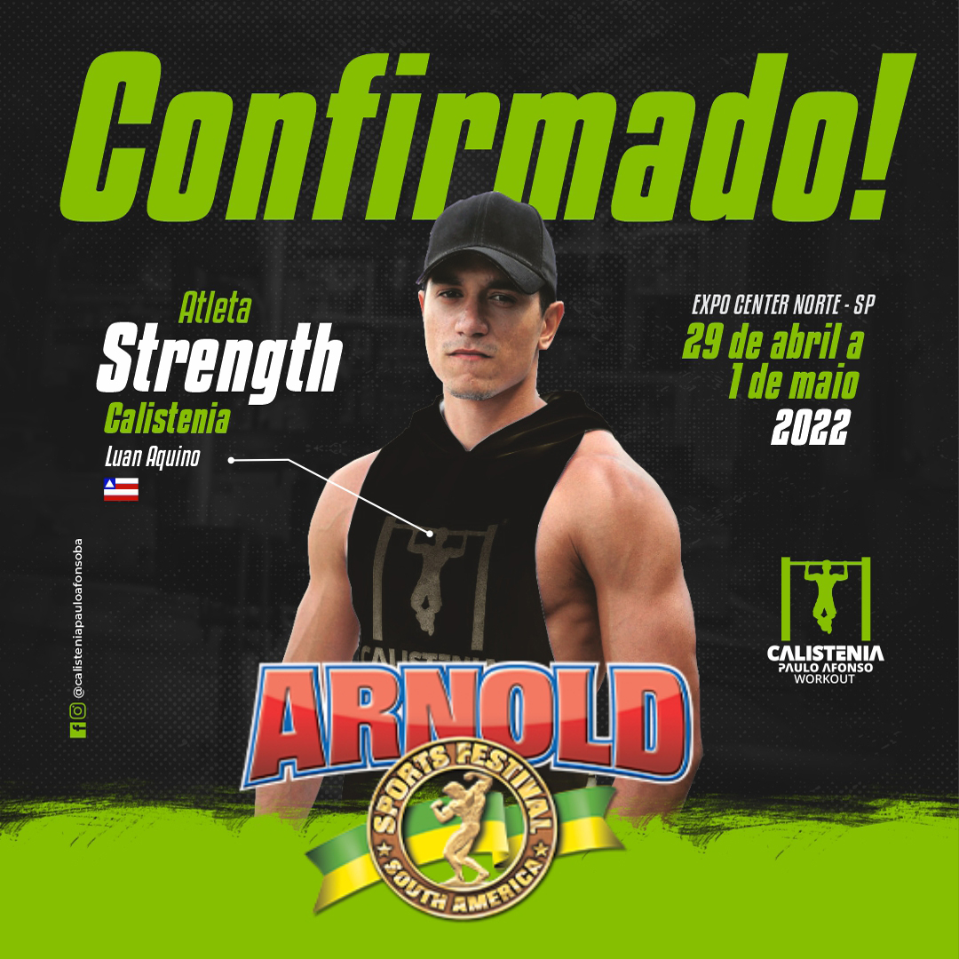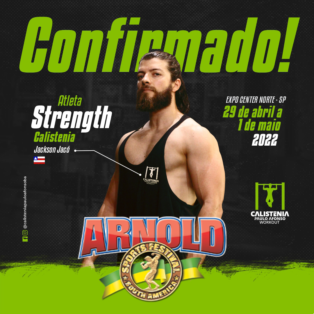 O “Arnold Classic South America 2022 – Street Workout” será realizado de 29 de abril a 1º de maio de 2022, no Expo Center Norte. Será uma competição bastante acirrada em São Paulo-SP, reunindo os melhores atletas do continente. Os atletas Jackson Jacó , Nara Costa e Luan Pereira, representará Paulo Afonso/Ba na modalidade Strength Livre.