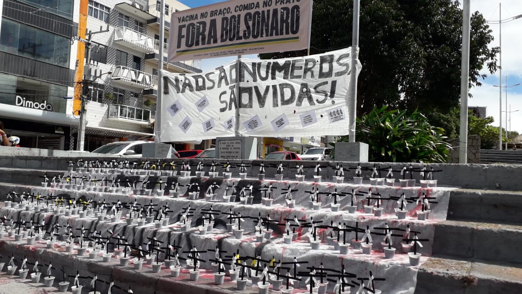 Através de uma intervenção artística, cruzes simbolizavam as 186 pessoas que perderam a vida na cidade em razão da pandemia e uma faixa “NÃO SÃO NÚMEROS, SÃO VIDAS” e “FORA BOLSONARO” se destacaram no espaço.