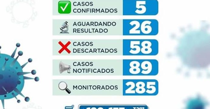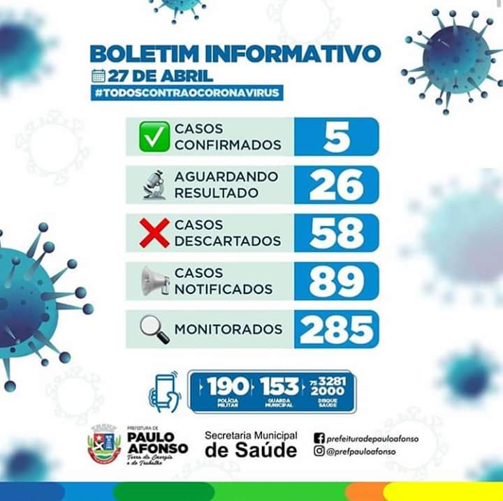 Paulo Afonso Bahia informa Boletim Coronavírus até a data de hoje 27 de abril de 2020, com 05 casos confirmados e 26 casos suspeitos de Coronavírus que aguarda os resultados para detecção do vírus.