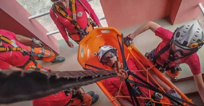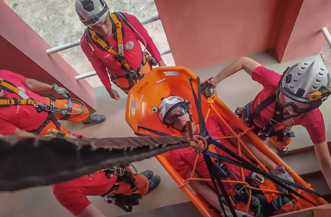 Descida de maca em escadaria com sistema de envio utilizando descenssor automático. Ideal para equipes reduzidas, uma vez que os resgatistas apenas guiam a maca pela escada, exigindo o mínimo de esforço físico.